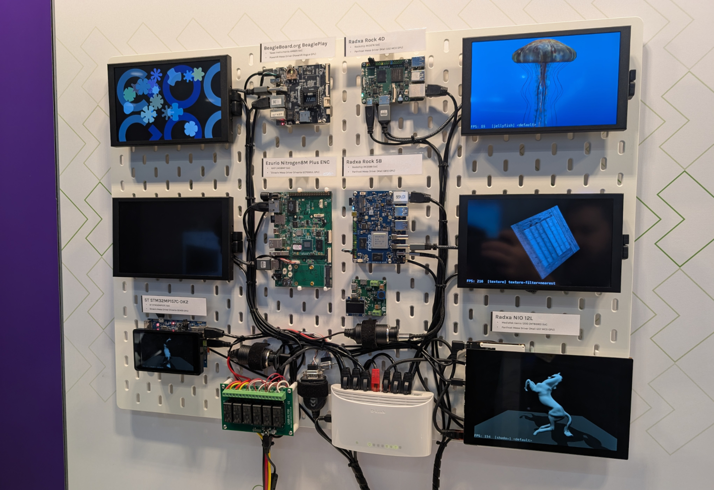 This year, devices in this demo were running the v6.13 or newer kernels. The majority of any patches applied to these kernels are part of our development work to upstream support for the relevant platforms. We look forward to these patches being part of future upstream kernel releases. The user space is built directly from Debian unstable (Sid) using debos. These images use the upstream Mesa graphics stack, with a Weston graphical environment. The majority of the boards were running glmark2 (Wayland ES variant), with the one board currently without an upstream working 3D GPU running a demo based on weston-flower. This last board stands as a reminder that whilst big steps have been made in recent years in the development of open GPU drivers, there are still platforms out there that don't yet have open drivers. Thus care is still required when choosing hardware if upstream support is something that you care about.