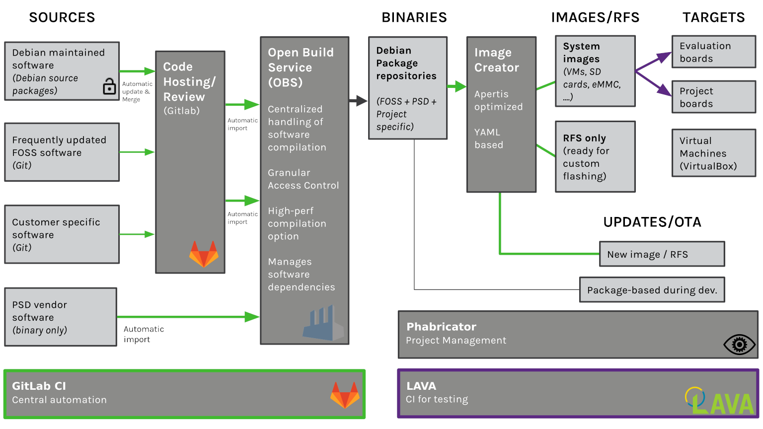 To build the distribution, Apertis also defines a CI-based collaboration workflow built on top of a well-integrated set of cloud services: