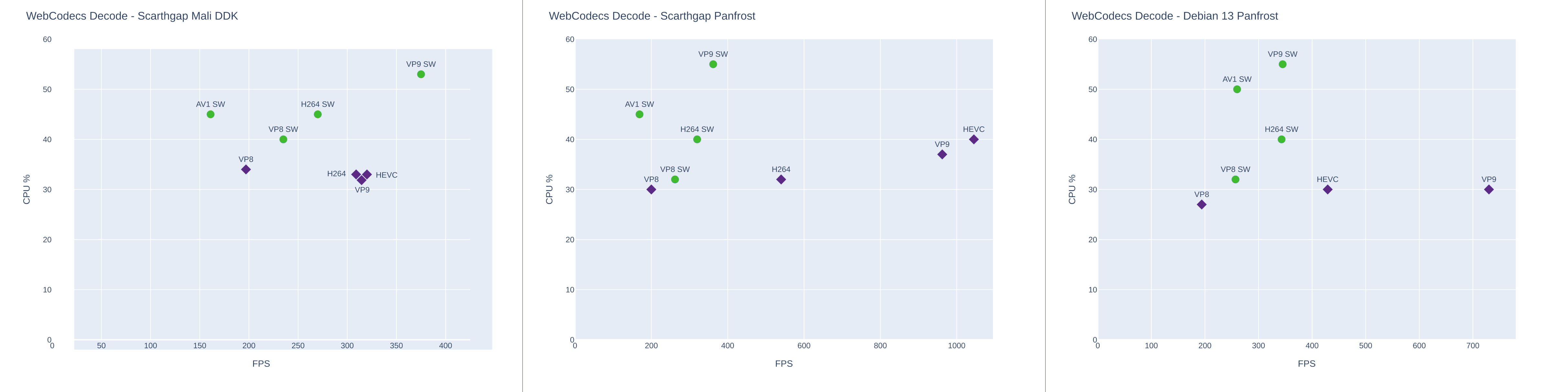 On Genio 700, playing back 4K VP9 content (YouTube, fullscreen) shows a clear win for hardware decoding: